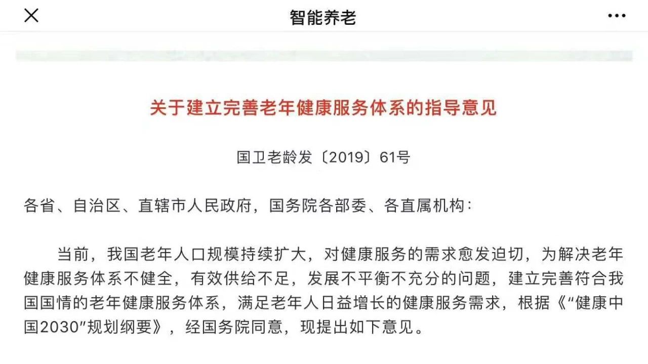近日,经国务院同意,国家卫生健康委、国家发展改革委、教育部、民政部、财政部、人力资源社会保障部、国家医保局、国家中医药局等8部门联合印发《关于建立完善老年健康服务体系的指导意见》(国卫老龄发〔2019〕61号,以下简称《意见》)