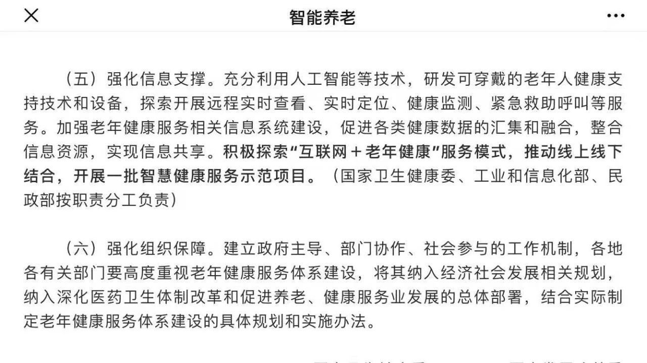 在此意见里按照老年人健康特点和老年人健康服务需求,向各部门提到了各自的工作任务和目标,并督促相关部门抓紧制定完善老年健康相关制度、标准、规范,为各项老年健康服务提供遵循。